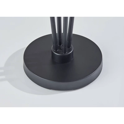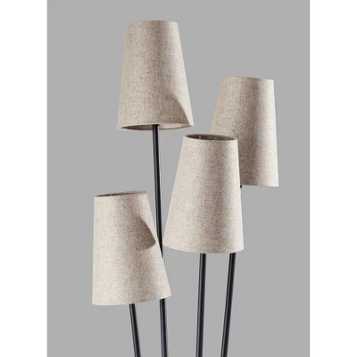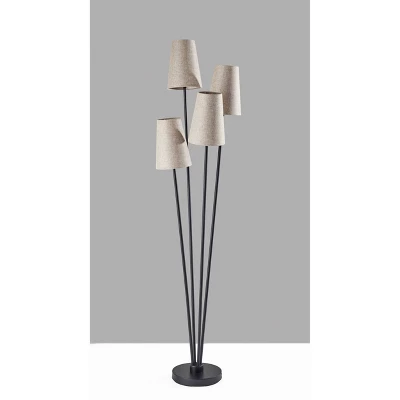 Four is better than one! The Wentworth floor lamp’s modern, asymmetrical four-arm silhouette blends contemporary design with classic materials to illuminate your space in style. The lamp features a simple, 10″ diameter round base in black metal finish supporting four matching thin stems that gradually fan out from the base. Topping the stems at varying heights are four beige textured linen shades to throw a soft glow from 40W bulbs. Powered by a 5′ black cord, the lamp is easily turned on or off with a foot step switch. The Wentworth floor lamp is also available with an antique brass finish and off-white textured fabric lampshades to complement mid-century modern décor.