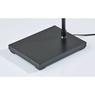 Stylishly illuminate any room with the contemporary design elements of the Zion floor lamp. The base and stand are constructed of monochrome black metal and feature clean lines and angles. A long slender pole rises from the compact rectangular base and supports a short arm. Suspended from the arm is a tall drum shade made of beige textured fabric that softly diffuses the light from a 100W bulb. Operated by a rotary switch to easily turn it on or off, the lamp also includes a 5′ black cord. The floor lamp is also available in antique brass with a white textured shade.