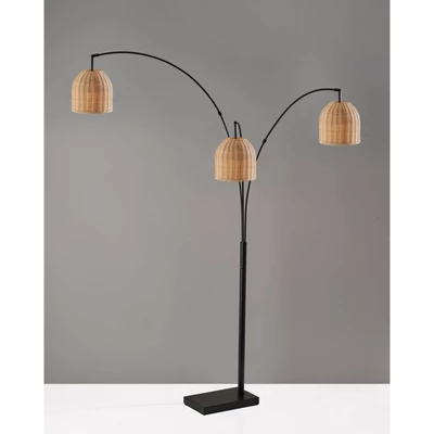 Bring a beach-bungalow vibe and warm glow to your home with the 82″ tall Bahama 3-arm arc lamp. The arcing design of this floor lamp makes it the perfect light source for reading in a recliner or working at a desk, while its slender metal pole and low-profile base in dark bronze finish make it easy to position near love seats, couches, armchairs, or side tables. The lamp features three arms, each topped with a 100W bulb (not included) and woven light rattan shade in an inverted basket shape to illuminate your space with a warm, relaxing light and create a natural focal point to any living space, bedroom, or office. For maximum versatility, the three arms can be swiveled and repositioned from the base, allowing you to direct the light wherever it’s needed. The light also features a 13″ x 9″ rectangular base in dark bronze finish that is both stylish and sturdy. Operated by a rotary switch located on the stem, this lamp features multiple lighting settings. A simple twist of the switch turns one lightbulb on, another twist turns two of the lightbulbs on, a third twist illuminates all three of the lights, and a fourth twist turns all lights off. Complete your space’s look with the coordinating Bahama 1-arm arc lamp, table lamp, floor lamp, and pendant light.