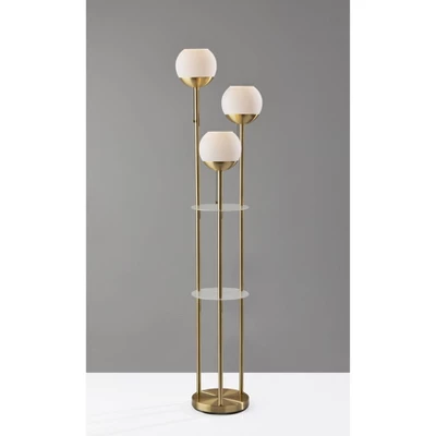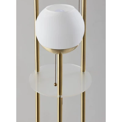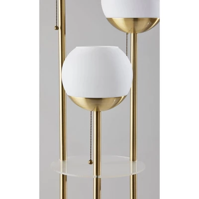 Bring a blend of style and function to your space with the 63″ Bianca floor lamp. Featuring two 10″ round frosted acrylic shelves, this lamp provides storage and display opportunities. The bottom shelf has a clearance of 34.75″, making it a perfect place to display vases, picture frames, or other taller items, while the 20″ clearance for the top shelf makes it ideal for placing drink glasses, phones, or other smaller pieces. The 10″ metal base with an antique brass finish makes for a sturdy design, while the three poles with an antique brass finish arranged in a triangular pattern rise cleanly to three lighting heads of varying heights for an eye-catching design. The three 7″ globe shades are made of white opal glass that complement the shelving and can be operated separately with pull chains, allowing you to control the amount of lighting. Each of the three globe shades ensconce 40W bulbs (not included), while the lamp also features a 5′ clear cord. The Bianca floor lamp is also available with a brushed steel finish.