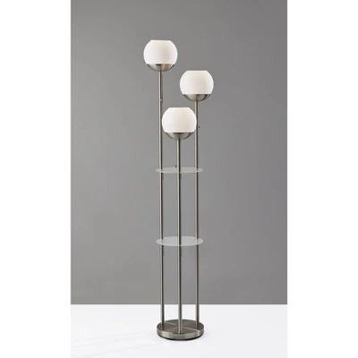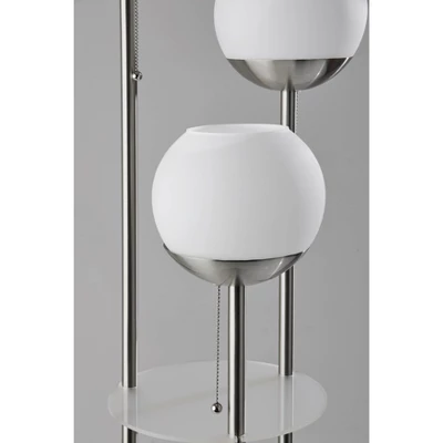 Bring a blend of style and function to your space with the 63″ Bianca floor lamp. Featuring two 10″ round frosted acrylic shelves, this lamp provides storage and display opportunities. The bottom shelf has a clearance of 34.75″, making it a perfect place to display vases, picture frames, or other taller items, while the 20″ clearance for the top shelf makes it ideal for placing drink glasses, phones, or other smaller pieces. The 10″ metal base with a brushed steel finish makes for a sturdy design, while the three brushed steel poles arranged in a triangular pattern rise cleanly to three lighting heads of varying heights for an eye-catching design. The three 7″ globe shades are made of white opal glass that complement the shelving and can be operated separately with pull chains, allowing you to control the amount of lighting. Each of the three globe shades ensconce 40W bulbs (not included), while the lamp also features a 5′ clear cord. The Bianca floor lamp is also available with an antique brass finish.