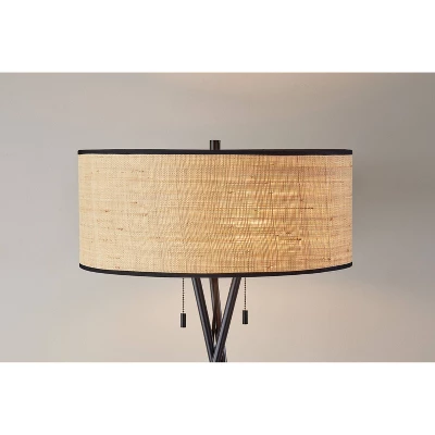 Make a statement with the modern chic silhouette and unique blend of materials found in the Bushwick floor lamp. This 60″ tall lamp features three tubes in black finish forming a tripod-shaped base and converging intricately at the bottom of the shade. The short drum shade measures 19″ in diameter and 8″ tall and is made of natural woven rattan to bring a warm glow. To further disperse the light from two 60W bulbs, the top of the lampshade features a diffuser. Each light is operated by a pull-chain switch ending in a black handle to complement the black lamp base, and the lamp is powered by a 5′ black fabric-covered cord. Complete your décor with the coordinating Bushwick table lamp.
