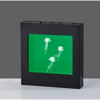 Who couldn’t use a calming influence? This Jellyfish Motion Light Box by Simplee Adesso provides the perfect soothing light for any room and can be wall mounted as eye-catching wall art or can stand free on tables, shelves, nightstands, or counters. Measuring 8.75″ tall by 8.5″ wide including a black plastic frame, this light box includes a 6.25″tall by 5.375″ wide rectangular window where white jellyfish glide peacefully through colored light. A 3-way push button switch controls the light. Push once to turn on the blue light, push again for a soothing color changing effect, and push once more to turn the light off. The 0.5W color-changing LED can be powered by either 4 “AA” batteries (not included) for a clean, wire-free aesthetic. Alternatively, the light box can be powered using the included 8′ USB cable for unlimited use without needing to worry about replacing batteries.