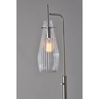 Add an elegant blend of mid-century modern and vintage design to your home with the slim silhouette of the brushed steel and glass 63″ tall Layla floor lamp. The brushed steel finish accentuates the 10″ diameter round base, thin stem, and socket while beautifully complementing the clear ribbed glass of the long and slender shade. With its open-bottomed tear-drop shape and ribbed texturing, the shade adds a distinctive look that leaves a 60W bulb slightly visible while softly diffusing the light. Operated by a rotary switch in brushed steel located on the tube-shaped stem to easily turn it on or off, the floor lamp also features a ?5′? clear cord. Complete your décor with the coordinating Layla desk lamp, wall lamp, and pendant lighting.